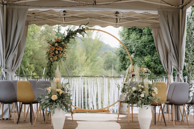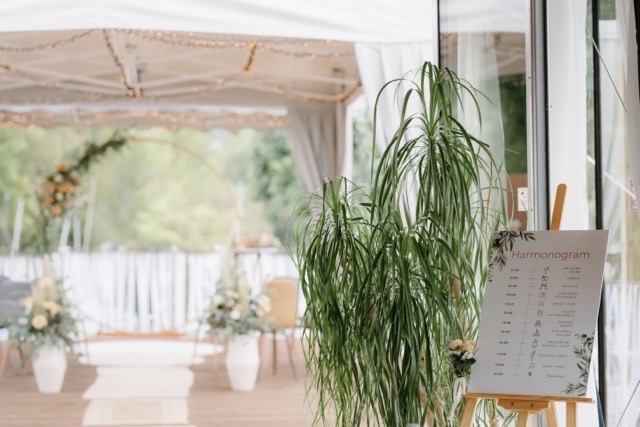 Kombinace dřeva, bílých stěn a otevřeného prostoru dává svatbě čistý a moderní vzhled.