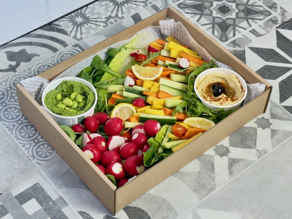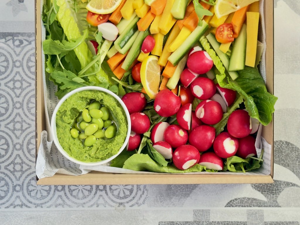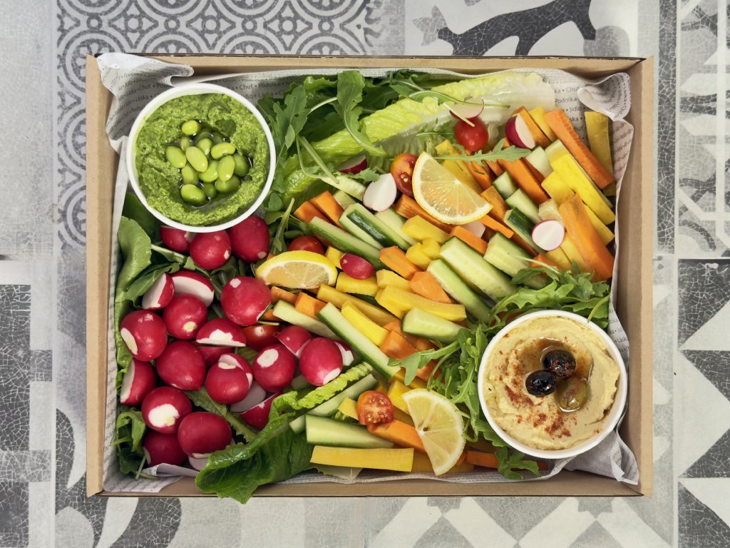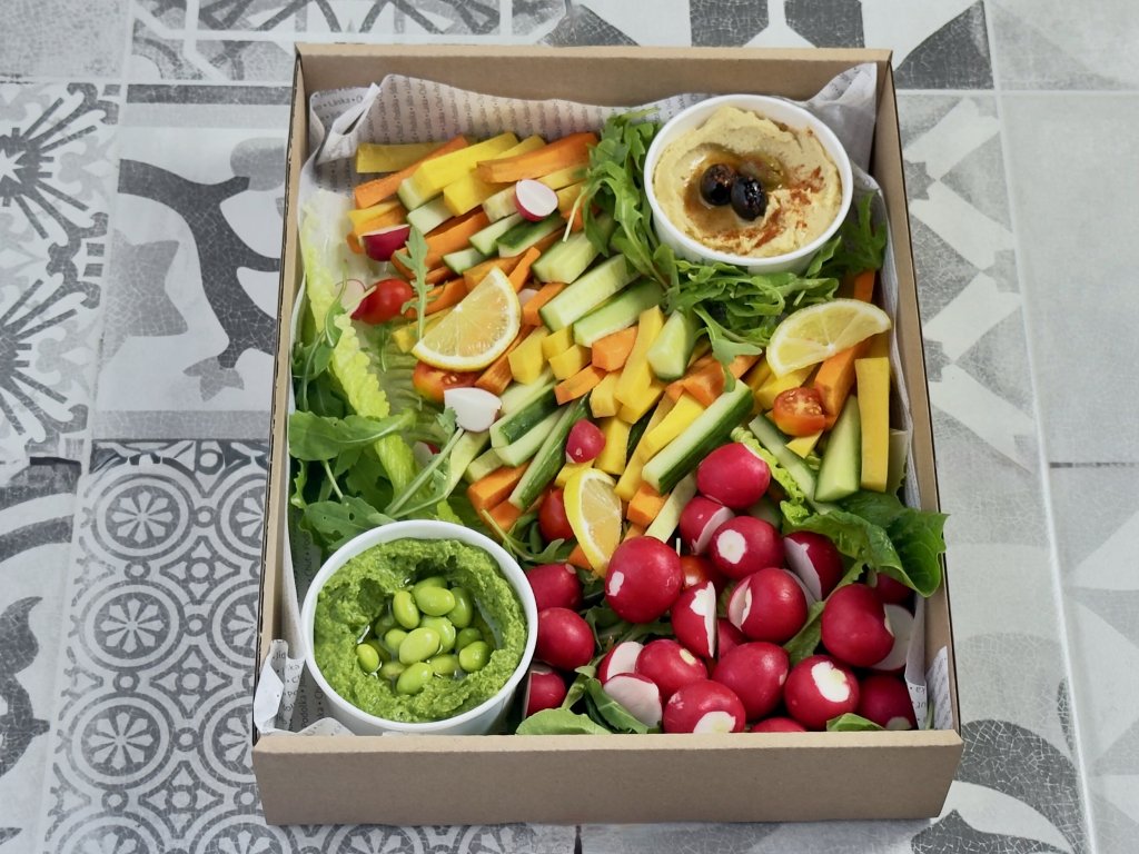 CRUDITÉS – krájená zelenina s hummusem cateringový box Podolka - (svatby, coffeebreak, grilování i lehký snack)