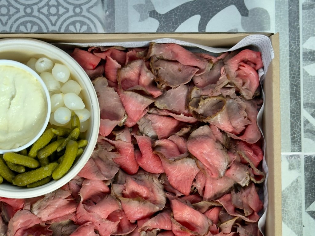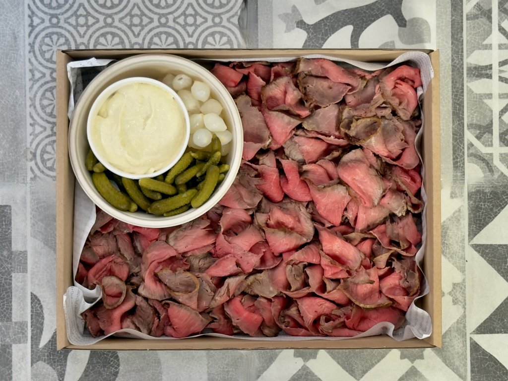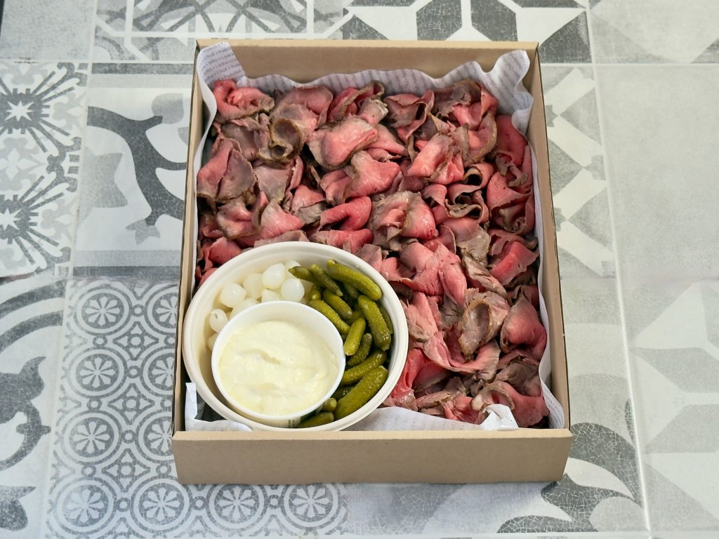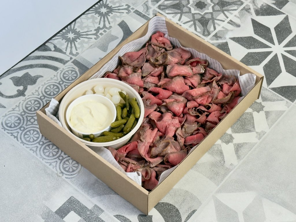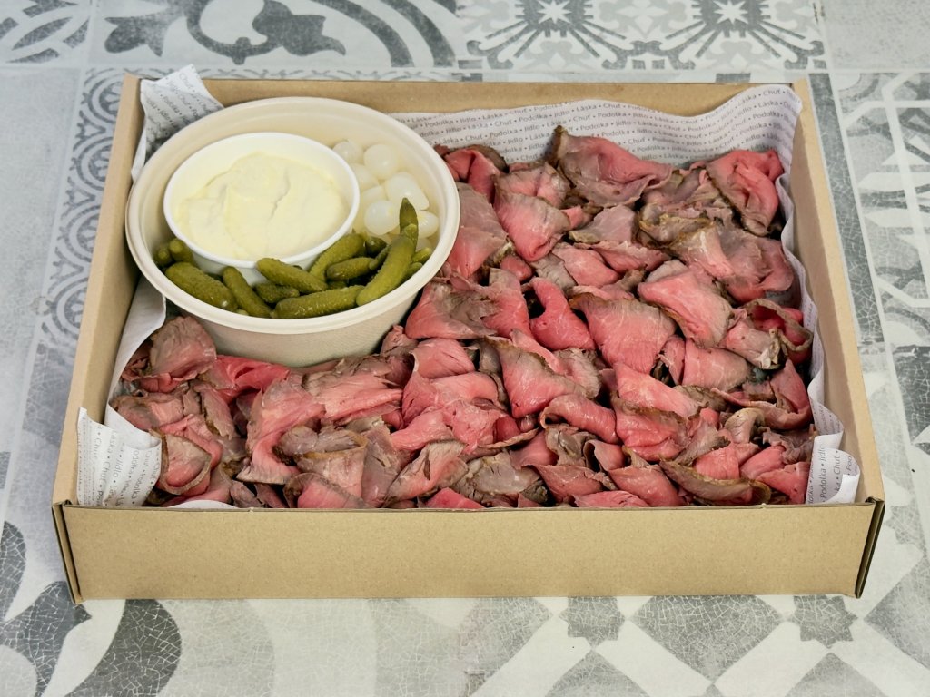 HOVĚZÍ ROASTBEEF s křenovou omáčkou a cornichony, skleněné cibulky cateringový box Podolka ( svatební raut, firemní catering i oslavy )