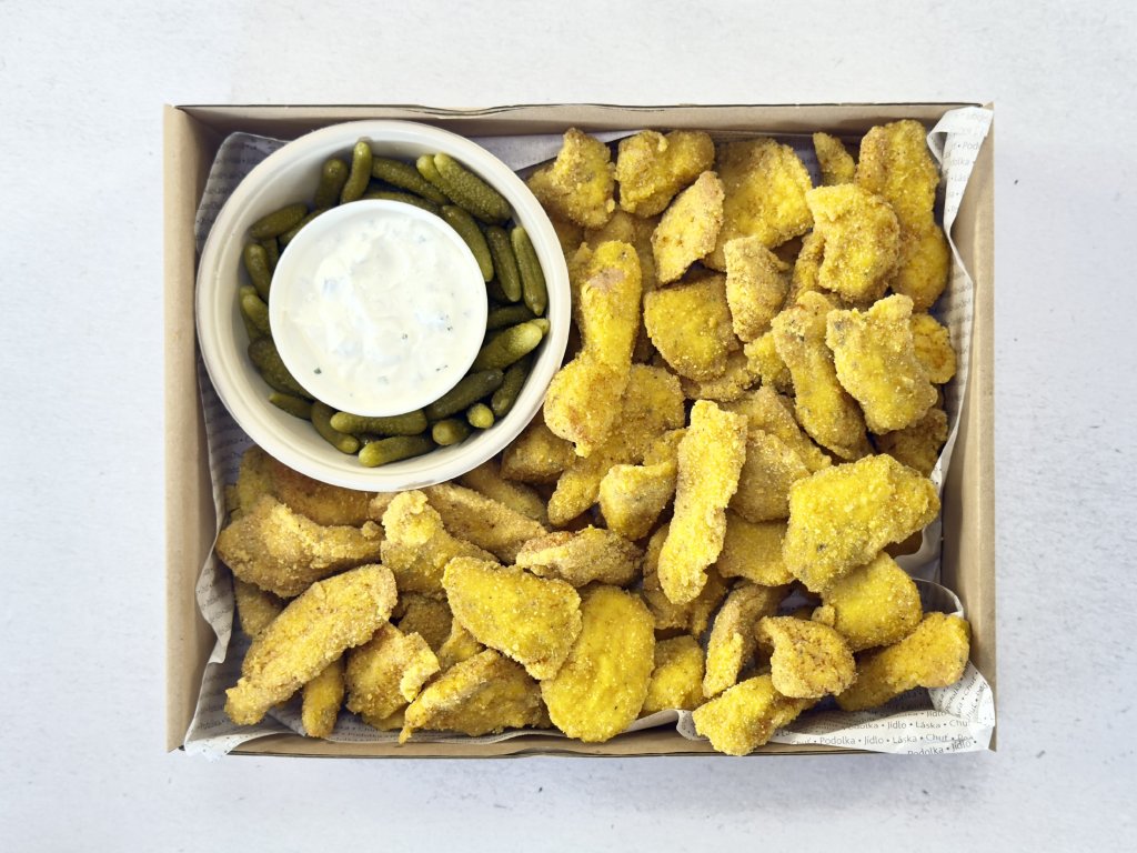 KRŮTÍ MINIŘÍZEČKY s pažitkovým creme fraiche a cornichony (raut, firemní coffebreak, svatební občerstvení, levný catering)