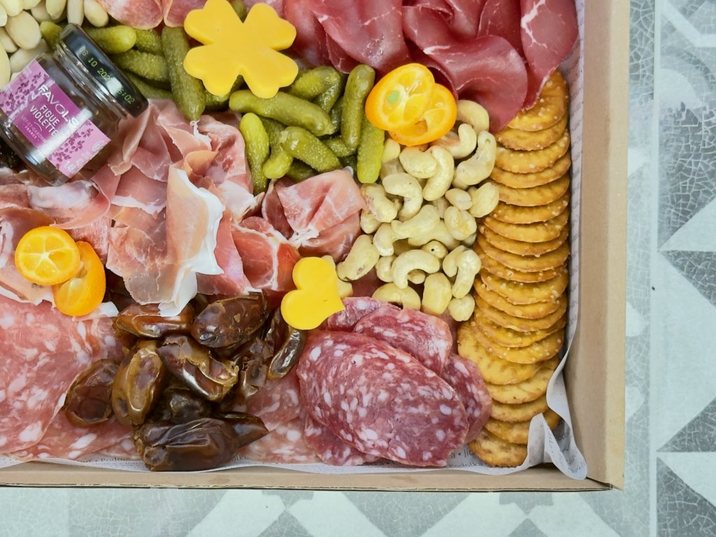 Doplňky: kešu, mandle, slané sušenky, cheddar, mini pomeranč, fíková marmeláda