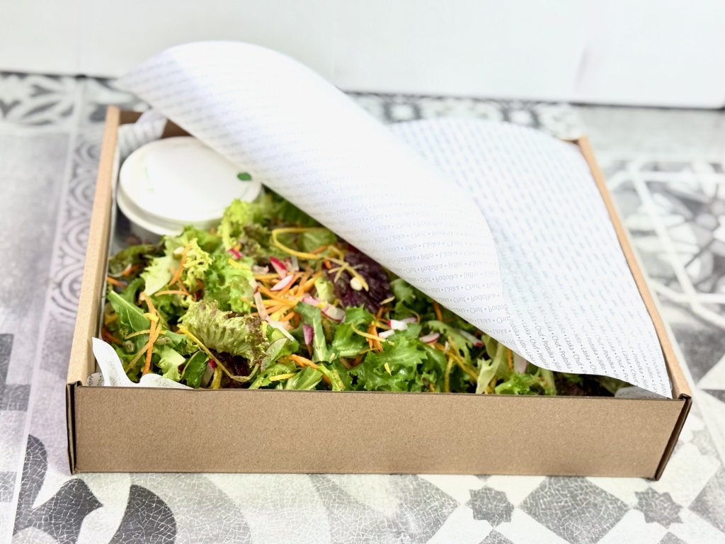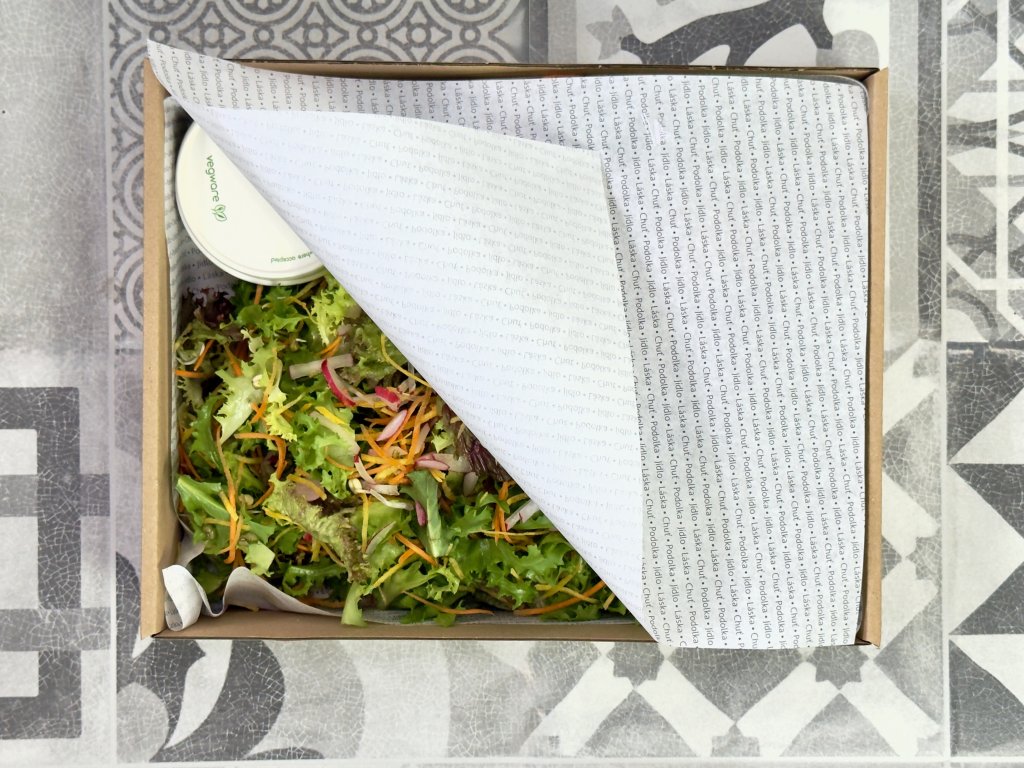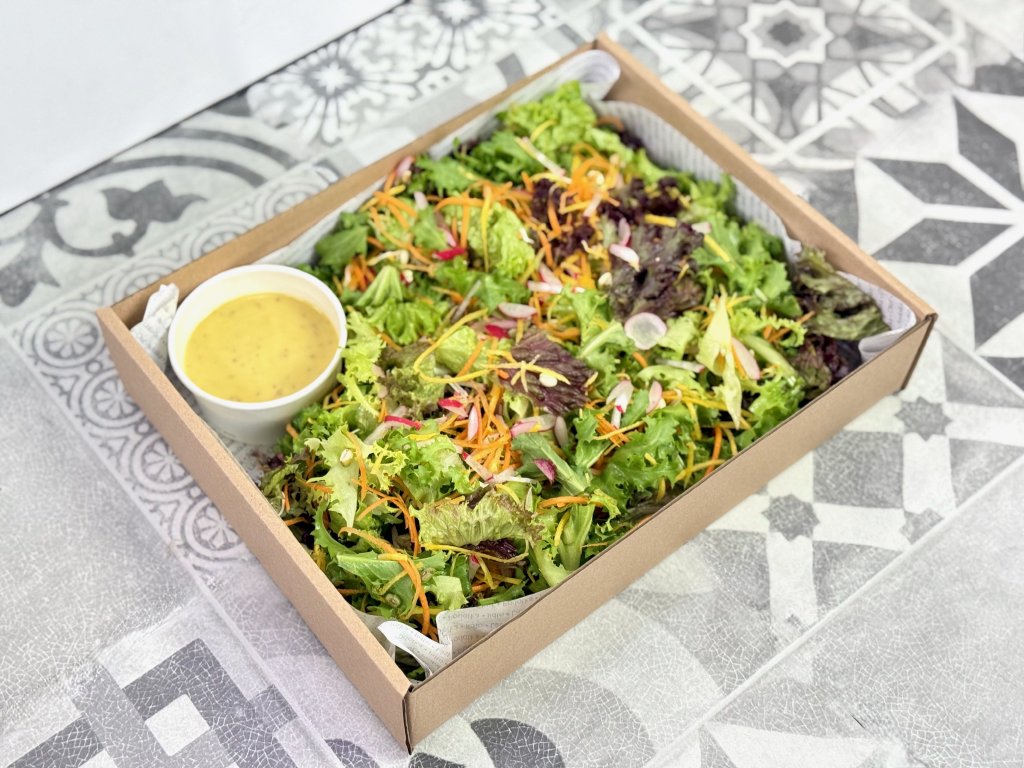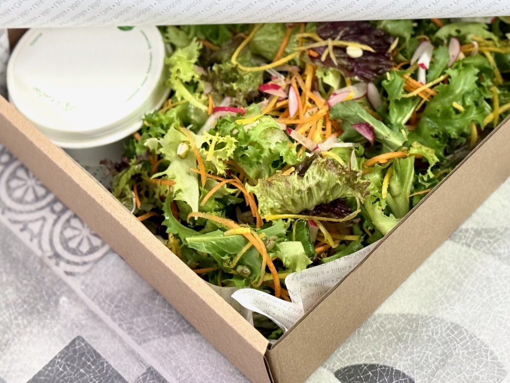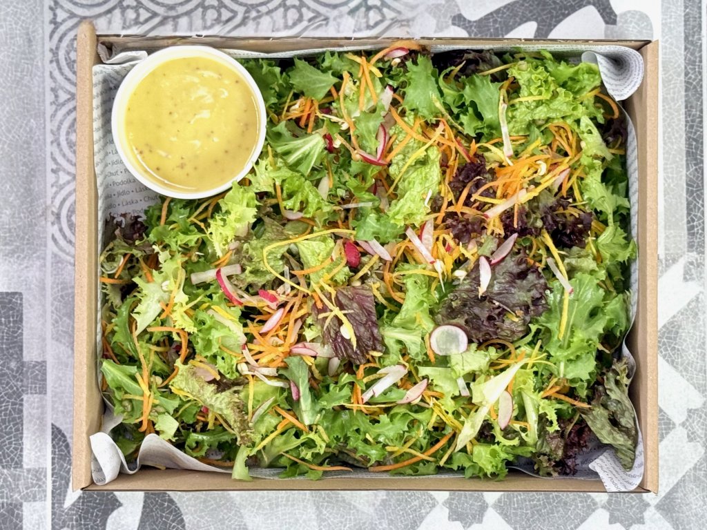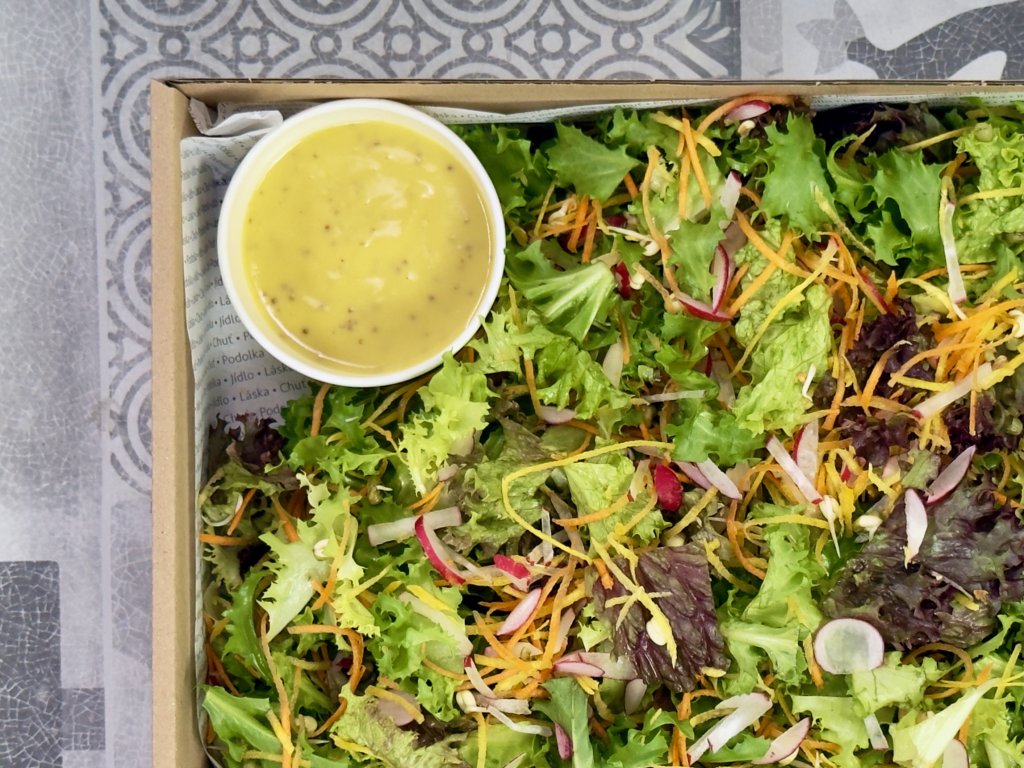 Základ tvoří mix listových salátů Lollo Biondo, Lollo Rosso a Frisée, doplněný o mungo klíčky, žlutou a oranžovou mrkev a ředkvičky. Vše završuje jemný francouzský dresing, který podáváme zvlášť v malé krabičce, aby zůstala zelenina křehká a čerstvá.