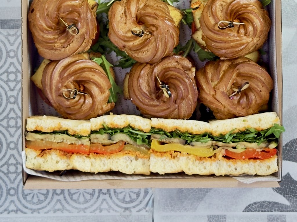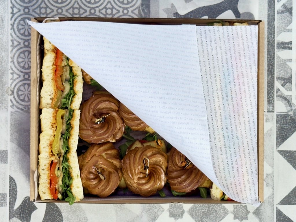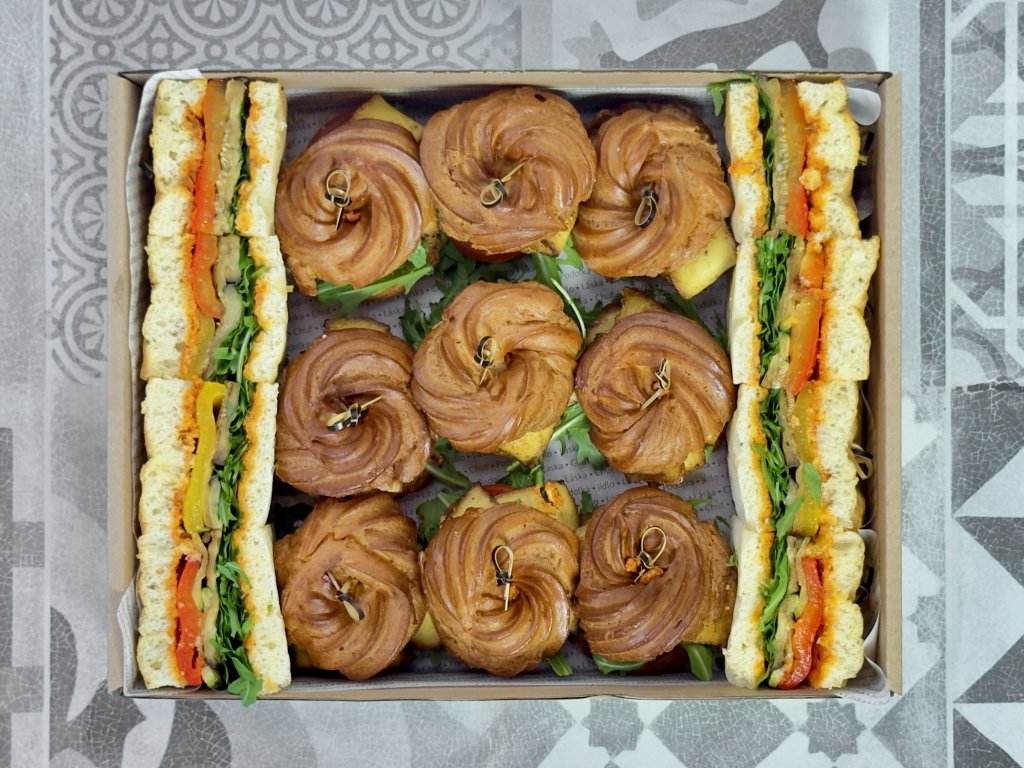 VERDE BOX – Focaccia s grilovanou zeleninou 8ks & Věnečky s uzeným tofu 9ks cateringový box Podolka (vegetariánský, bezlaktózový catering – svatby, coffeebreak, rauty)