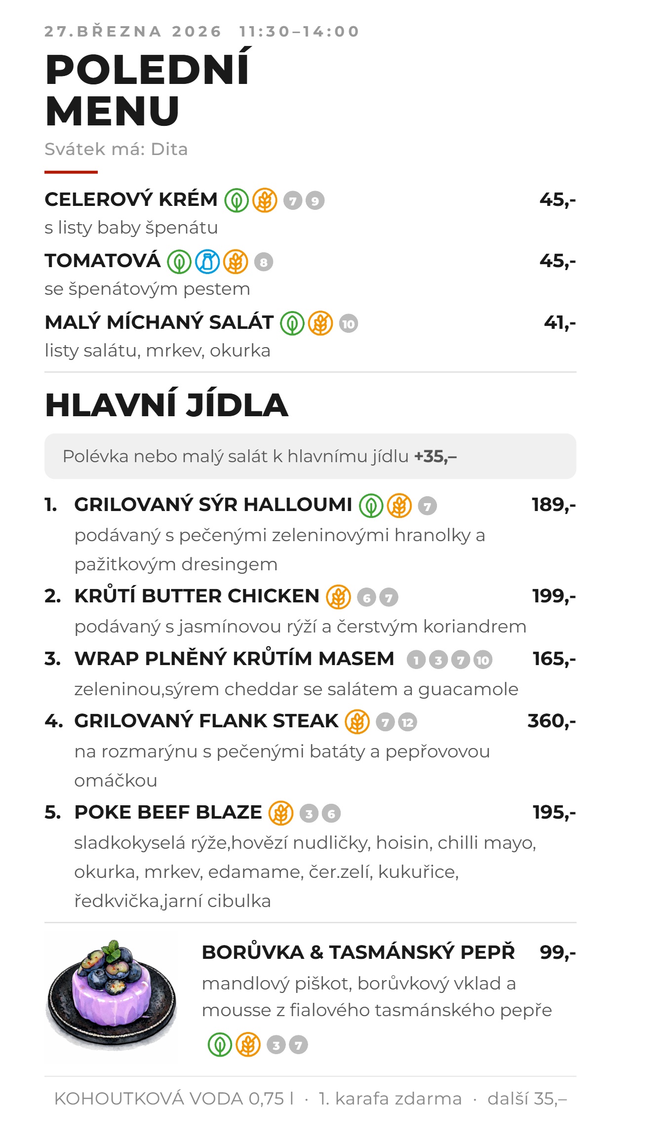 Polední menu podáváme od 11:30 do 14:00. K polednímu menu podáváme první karafu vody zdarma. Zvýhodněná cena s polévkou.