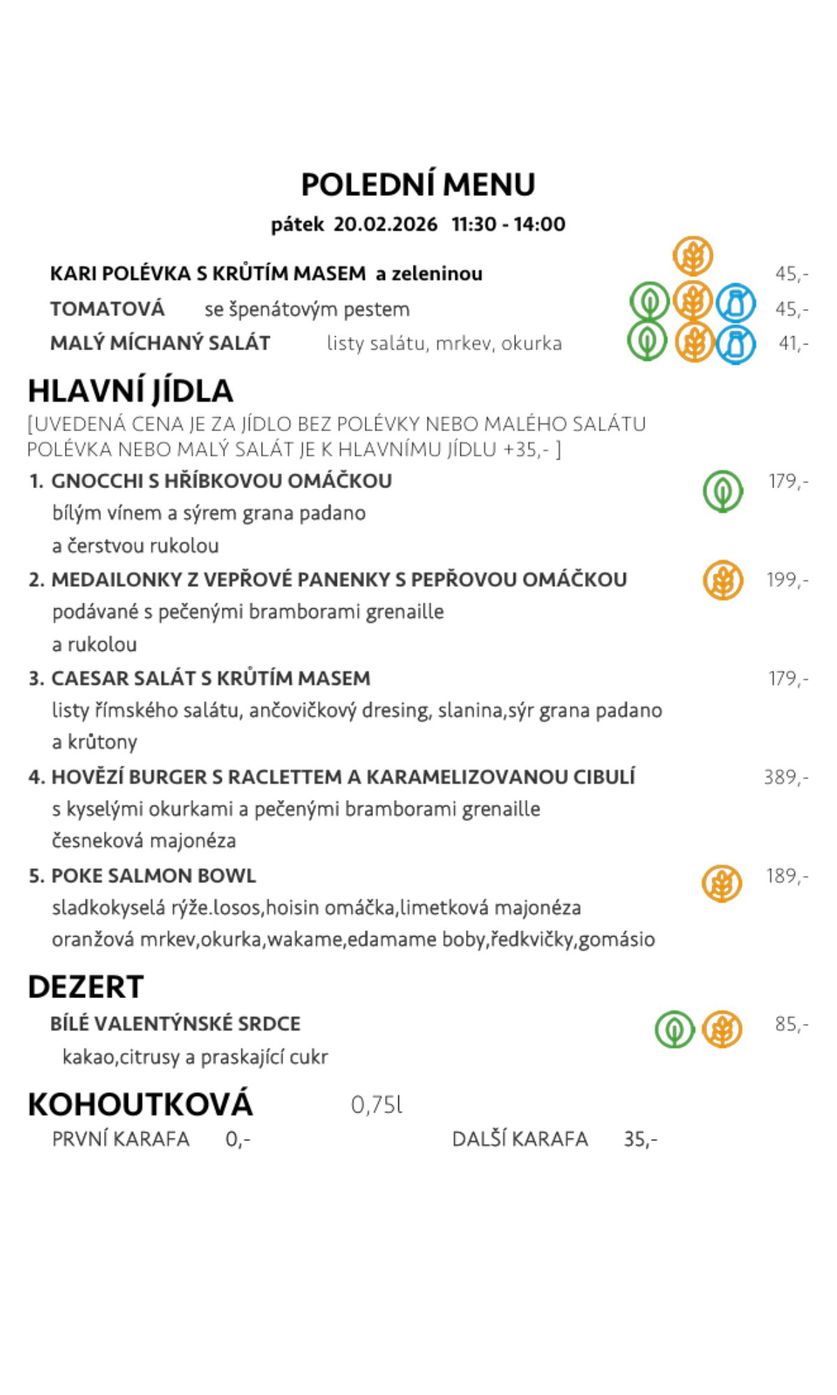 Polední menu podáváme každý všední den od 11:30 do 14:00. O víkendech a státních svátcích polední menu nepodáváme.