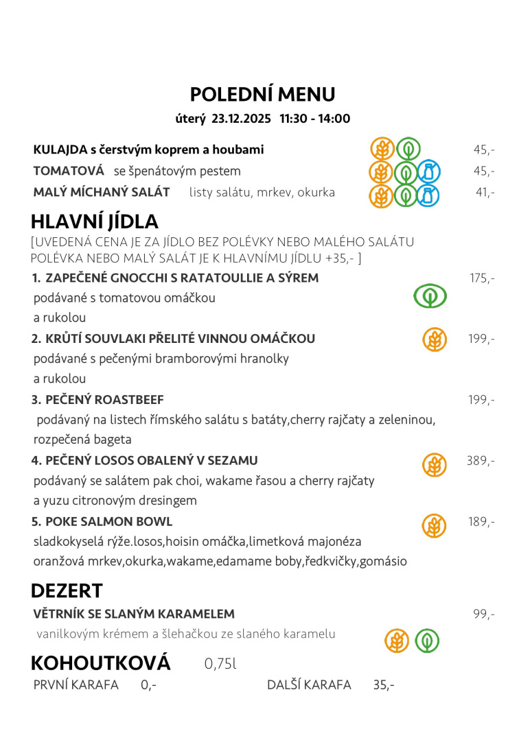 • Polední menu podáváme od 11:30 do 14:00. K polednímu menu podáváme první karafu vody zdarma. Zvýhodněná cena s polévkou.