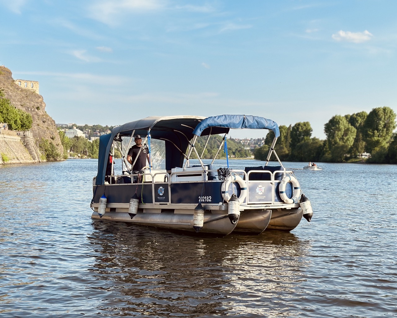 Náš vltavský ponton Novontón nabízí klidnou vyhlídkovou plavbu s příjemným posezením blízko vodní hladiny a možností vyzkoušet si waterbike nebo paddleboard na palubě.